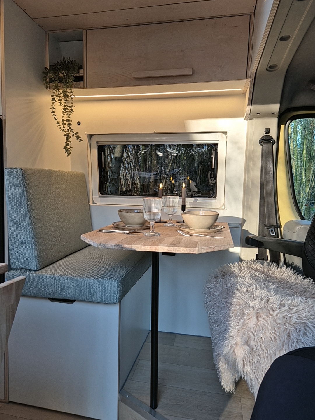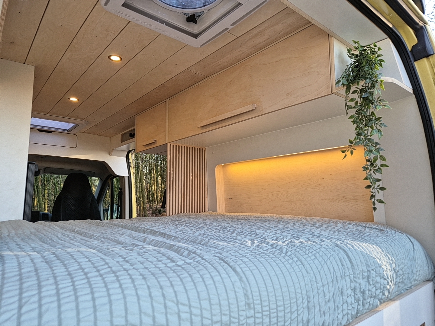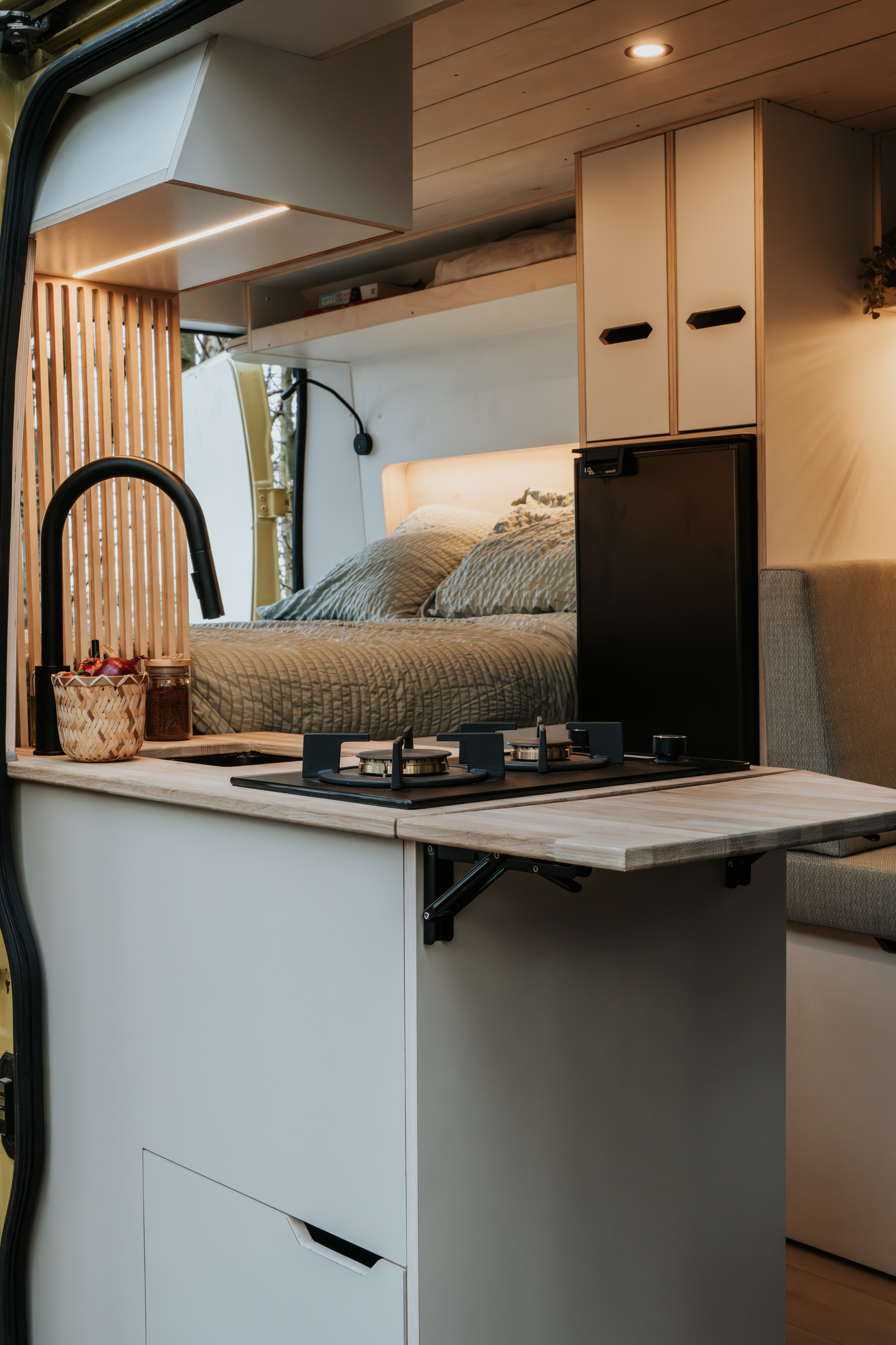 Camper Patito is een compacte camperombouw met een rustige, natuurlijke uitstraling. Zachte tinten, warme houtdetails en een licht interieur zorgen voor een ontspannen sfeer waarin je je direct thuis voelt. Een fijne plek om tot rust te komen, maar ook om geconcentreerd te werken op afstand.